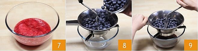 to extract the juice and pulp of the currants 7. Pour the blueberries into the food mill 8; also pass them through several times with slow movements 9,