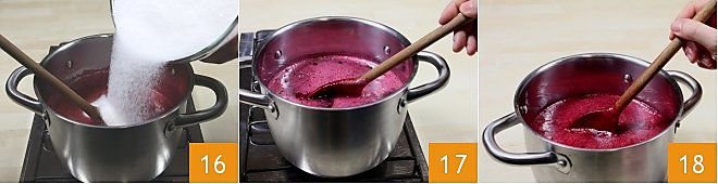 After 1 minute, add the sugar 16 and bring the mixture back to a boil. Boil for 3 minutes on high heat 17, always stirring. Remove the pot from the heat and keep stirring so that any foam created on the surface 18,