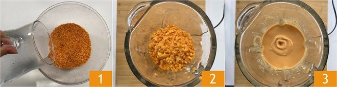 To make the red lentil lentil tofu, first cover the lentils with hot water and let them soak for about 30 minutes 1. After this time, transfer the lentils with their water into a blender 2, add salt and blend at the highest speed; if necessary, add a little cold water and use a spatula to push the mixture towards the blades. You should achieve a smooth and homogeneous consistency 3.