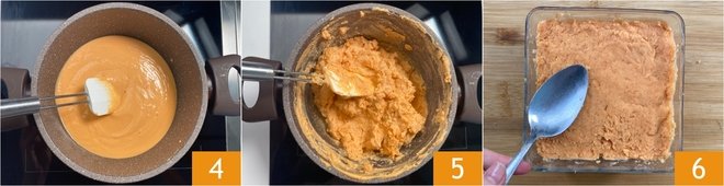 Pour the puree into a non-stick pan and cook, stirring continuously 4 until it becomes thick and sticky 5; it will take about 10 minutes. Transfer the mixture into a glass container, level the surface well 6, and cover with a sheet of parchment paper in contact. Let it firm up in the refrigerator for about 5 hours.