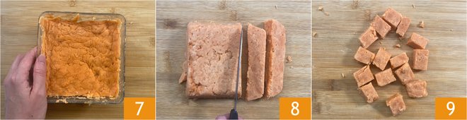 Once firm 7, flip the block and remove the parchment paper, then cut it into cubes of the desired size 8: your red lentil lentil tofu is ready to be used 9!