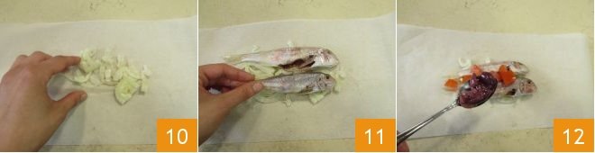 At this point, you can proceed to form the parcels. On a sheet of parchment paper, create a bed of fennel 10 and then place 2 cleaned red mullets on top 11. Add the tomatoes and olives 12,