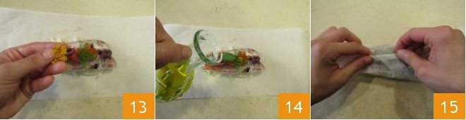 then a bit of fennel fronds and some grated orange zest 13. Scent with a basil leaf, a bit of salt and pepper, and finally a drizzle of oil 14, and to finish, close the parcel as if it were a candy 15.