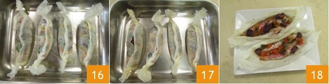 Place the four parcels on a baking sheet and sprinkle with a bit of oil 16, bake in a preheated oven at 356°F for about 25 minutes 17. As soon as they are ready, serve your fragrant red mullets en papillote immediately 18.