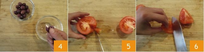Rinse the olives and remove the pits, placing the pitted ones in a small bowl as you go 4. Then clean the tomatoes and cut them in half: remove the stem by making a V-shaped cut 5 and remove the pulp with the seeds 6.