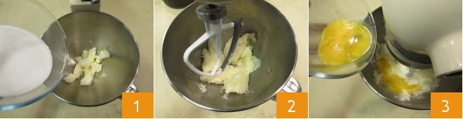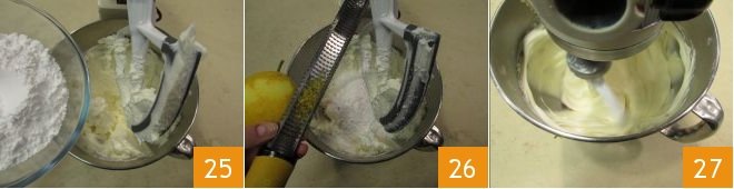 Then add the powdered sugar 25 and the grated lemon zest 26. Work everything for 3-4 minutes, increasing the mixer speed. You should obtain a smooth and soft consistency 27.