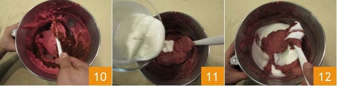 Mix very gently with a spatula using movements from bottom to top: mix just enough to absorb the cocoa, only this way will you avoid deflating the batter 10. Add the yogurt all at once 11 and mix carefully using the spatula 12.