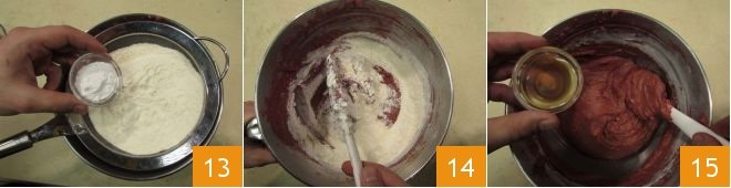 Sift the flour along with the baking powder directly into the mixer bowl 13. Mix from bottom to top 14 until completely incorporated and you have a homogeneous mixture. Finally, add the vinegar 15