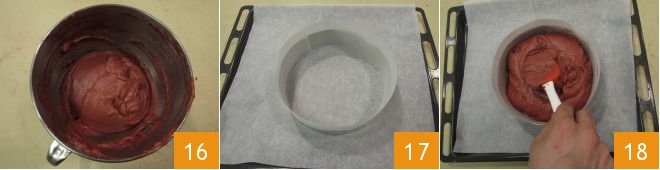 and mix again 16. Position a 20 cm (8-inch) pastry ring on a baking sheet lined with parchment paper. Line the ring with a strip of parchment paper to raise the edge 17. Pour the batter inside and level the surface with a spatula 18.