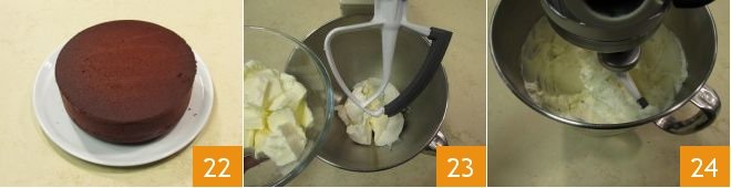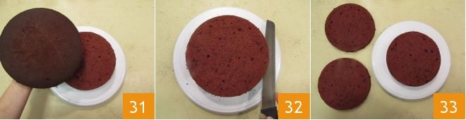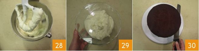 At this point 28, transfer to a bowl 29 and place in the refrigerator for about 15 minutes. In the meantime, proceed to cut the cake. You can make small incisions in 3 points of the cake to be more precise. Then, with a serrated knife, cut the first layer, continuously rotating the cake 30.