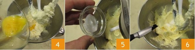 Continue working the mixture and when absorbed, add the rest of the eggs 4; work for a few more moments, then add the salt 5 and the seeds of the vanilla bean 6.