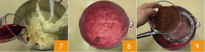 Turn on the mixer again for a few seconds at medium speed, then add the red food coloring 7 and whip everything for 3-4 minutes until you get a smooth and fluffy mixture 8. Stop the mixer, detach the bowl, and sift the cocoa powder inside 9.