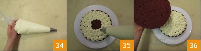 At this point, place the frosting in a pastry bag fitted with a plain tip 34. Start assembling the cake, keeping in mind that the part that was your initial surface will now be the bottom layer. Fill the cake with about 1/3 of the frosting by squeezing out dollops 35 and placing them next to each other to cover the entire surface of the cake. Place the second layer of cake on top 36