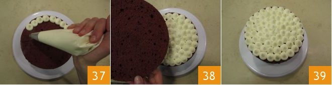 and do the same as before, filling it with half of the remaining frosting 37. Then place the last layer 38 and finish decorating with dollops of cream cheese frosting 39.