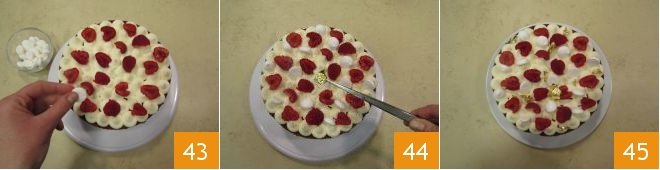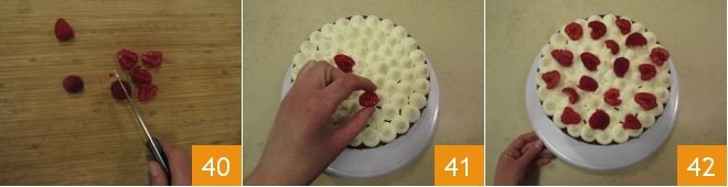 Cut the raspberries in half 40 and use them to decorate the cake, spreading them out neatly (41-42).