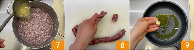 Add a ladle of hot broth at a time 7 and cook the rice until it's al dente, about 14 minutes, but follow the package instructions. In the meantime, prepare the sausage by removing the casing and breaking it into small pieces 8. In a non-stick pan, pour the oil and add the garlic 9.