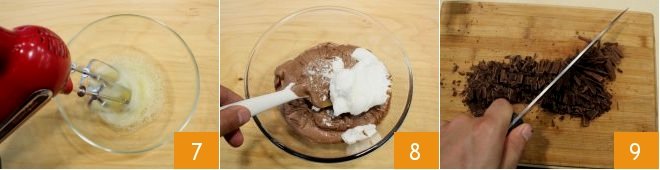 In a separate bowl, beat the egg whites you set aside to stiff peaks using an electric mixer 7; once the egg whites are whipped, gently fold them into the mixture in three additions 8 using a spatula, mixing from bottom to top to avoid deflating the batter. Then, finely chop the dark chocolate with a knife 9,