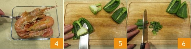 When the wine has evaporated, turn off the heat, remove the shrimp and set them aside, keeping them warm 4. Next, prepare the peppers. Take the peppers, wash and dry them, then cut them in half, remove the green stem, the white filaments, and the seeds inside 5. Then cut them into vertical strips and proceed by cutting them into cubes 6.
