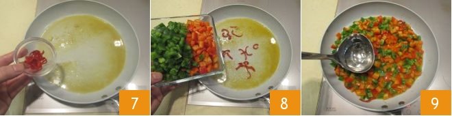 Add the chili pepper to the pan with the shrimp cooking base 7 and then add the chopped peppers 8. Adjust with salt and pepper. Then add some ladles of the reginette cooking water to better bind the mixture 9.
