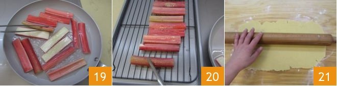 Turn the rhubarb with kitchen tongs and continue cooking 19. Then place it on a rack to drain the excess syrup and let it cool 20. Once the time has passed, take the pastry dough and with the help of a rolling pin, roll it out on a slightly floured work surface 21.
