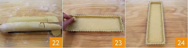 Butter and dust a tart pan measuring 13.8x4.3 inches with flour, then lay the shortcrust pastry with the help of the rolling pin 22. Remove the excess edges, cutting them with a small knife, and make the pastry adhere well to the pan by pressing it with a ball of dough wrapped in a piece of plastic wrap (23-24).