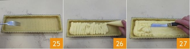 Prick the base of the tart with the prongs of a fork 25, then transfer the now cold custard into a pastry bag without a nozzle to which you can make a cut and distribute it on the base 26, smoothing it well with a spatula 27.
