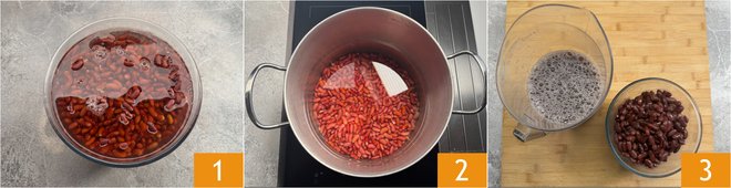 To prepare rice and beans, first soak the beans in cold water for 8 hours, or preferably overnight 1. Rinse them and transfer them to a pot with plenty of cold unsalted water 2. Cook for 1 hour from boiling. Drain and set aside both the beans and their cooking broth separately 3. Keep the latter warm.