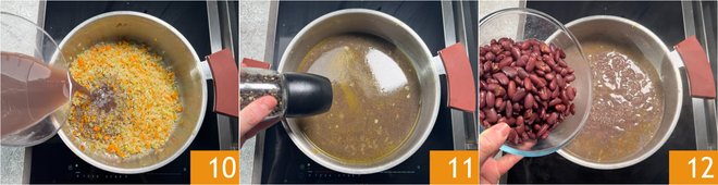 Add about 3 1/2 cups of the hot bean broth 10, season with salt and pepper 11. Once it returns to a boil, cook, stirring occasionally, according to the cooking time of the rice on the package, about 15 minutes. In the last 3-4 minutes before the end of cooking, add the beans 12 and mix well.