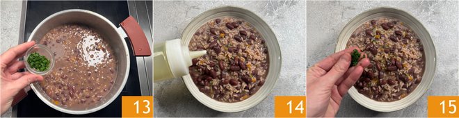 Once cooked, turn off the heat, add the chopped parsley 13, and stir. Taste and, if necessary, adjust the salt and pepper. Plate, complete with a drizzle of raw oil 14, and a sprinkle of chopped parsley 15. Your rice and beans are ready to be enjoyed!
