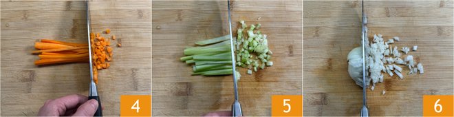 Clean and dice the carrot 4, celery 5, and onion 6.
