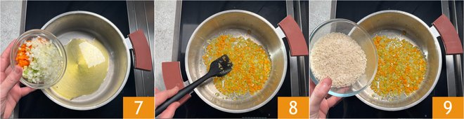 In a pot, pour a drizzle of oil, add the vegetables 7, and stew over a low flame for about 8 minutes, stirring often 8. Add the rice and let it flavor for 2 minutes 9.