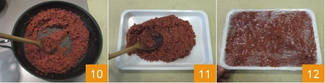 After about 25 minutes, the risotto will be ready; it should be firm 10. Spread the rice on a tray 11, distributing it evenly, cover it with cling film in contact with the surface 12, and place it in the fridge to cool because it needs to be very cold to form the burgers.