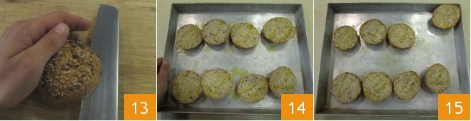 Now take the buns, cut them in half 13, place them on a baking sheet, drizzle with a little oil 14, and toast them in a preheated oven at 392°F (200°C) for about five minutes. Keep the bread warm 15 and continue with the preparations.