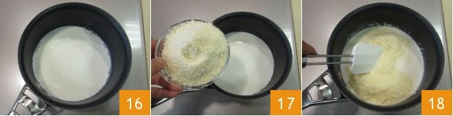 Prepare the Grana Padano DOP sauce: bring the milk to a boil 16, add the grated Grana Padano DOP 17, and stir well 18;