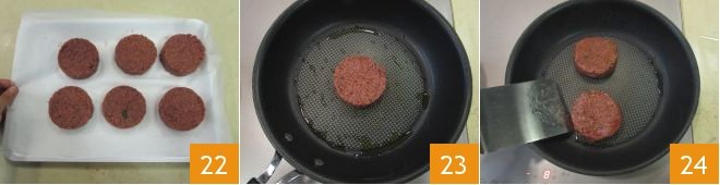 As you shape the burgers, place them on a tray lined with parchment paper 22. Pour a little oil into a pan, and when it's hot, sear your burgers on both sides 23 for a couple of minutes 24.