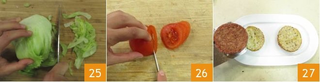 Finely slice the iceberg lettuce 25 and slice the beefsteak tomato 26. Now assemble your burgers as follows: place half of a bun on a plate, then layer with the burgers 27,