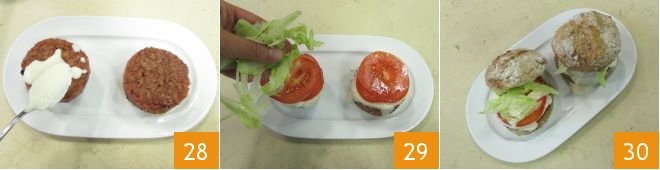 a generous amount of Grana Padano DOP sauce 28, a slice of tomato, the lettuce 29, and close with the other half of the bun 30. Your rice and beetroot burgers with Grana Padano sauce are ready, enjoy them right away!