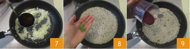 Continue cooking the rice by adding the hot beetroot water 7. Salt, add mint leaves 8, and about halfway through, pour in the beetroot puree 9. Stir to flavor and continue cooking by adding beetroot broth as needed.