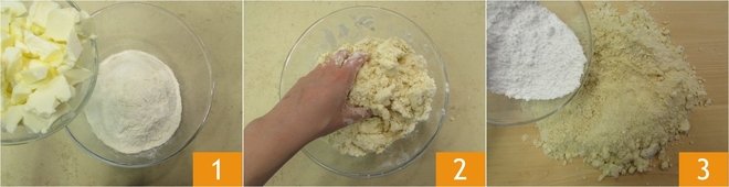 To prepare the rice cream pasticciotti, first make the pastry dough. In a bowl, pour the flour and cold butter cubes 1, mix them well with your hands until you obtain a "sandy" mixture. Transfer to a work surface and add the powdered sugar 3.