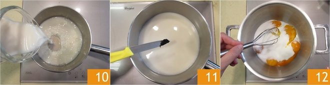 In the meantime, prepare the cream: pour the rice milk into a small pot 10, add the vanilla seeds 11 and bring it to just under a boil. In another pot, pour the eggs, the yolk, and the sugar; mix with a whisk 12 until you obtain a well-blended mixture.