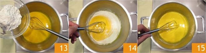 Add the flour 13, mix, and also add the cornstarch 14. Blend well with the whisk. You should get a smooth mixture without lumps.