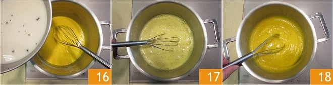 As soon as the milk starts to boil, slowly pour it into the egg yolk mixture 16, continuing to mix. Cook over low heat, always stirring, until the cream reaches the desired consistency 18.