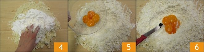 Mix with your hands 4 and form a well. Pour the egg yolks in the center 5 and the vanilla bean seeds 6.