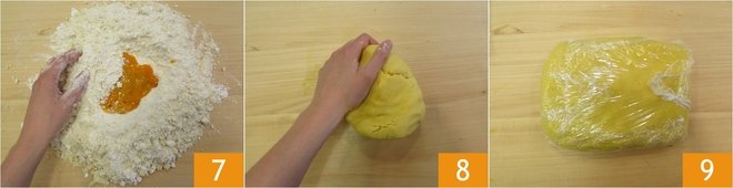 Knead quickly with your hands 7 until you get a smooth and homogeneous dough 8. Wrap it in plastic wrap 9 and let it rest in the refrigerator.