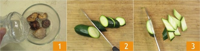 To make the rice dumplings with vegetables, first cover the dried mushrooms with warm water 1 and let them soak for about 20 minutes. Meanwhile, prepare the other vegetables: cut the zucchini obliquely into rather thick slices 2, then cut them into strips 3.