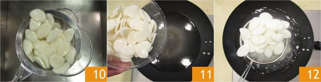 Rinse the rice dumplings under running water 10. Meanwhile, bring some water to a boil in a wok, then add a drop of oil to prevent them from sticking together. Cook the dumplings in the boiling water 11 and drain them after one minute 12.