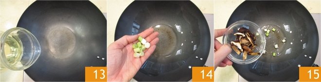 In the same wok, heat a swirl of oil 13 and sauté the white part of the spring onion for a minute 14, then add the drained mushrooms 15.