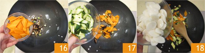Add the carrots 16 and sauté for another minute. Add the zucchini 17 and sauté for 2-3 minutes. Finally, add the dumplings 18.