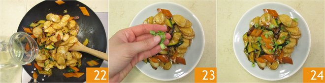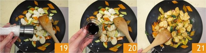 Season with salt 19 and pepper, then flavor with light and dark soy sauce 20. Mix and briefly sauté everything 21.