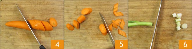 Do the same with the carrots: after peeling them, cut them first into slices 4 and then into strips 5. Also, slice the white part of the spring onions 6.